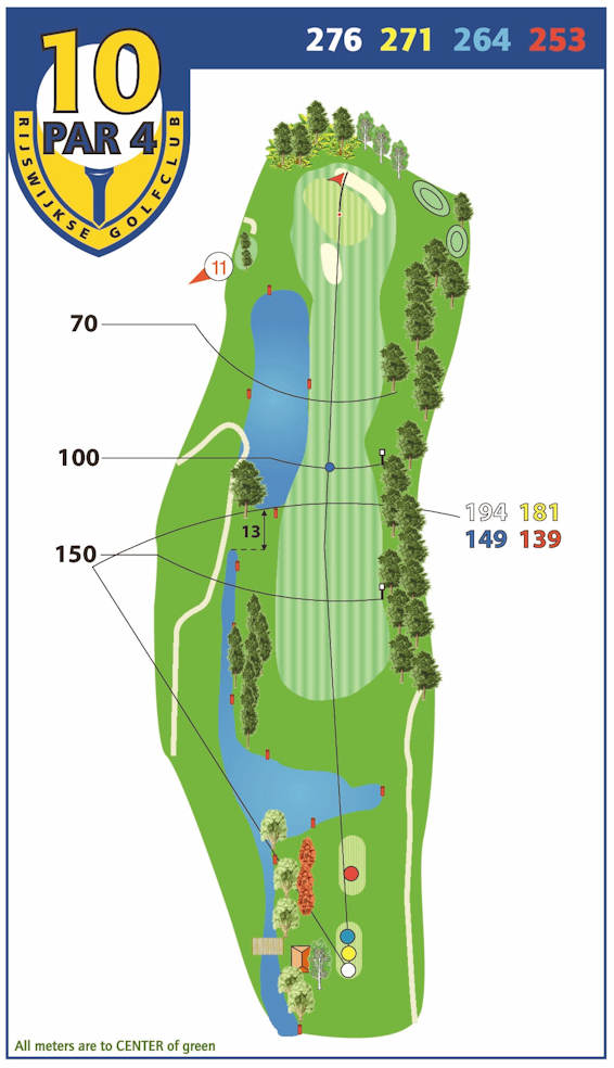 Probeer dicht bij het water te komen van de tee en houd er rekening mee dat het schot naar de green vaak iets korter speelt.