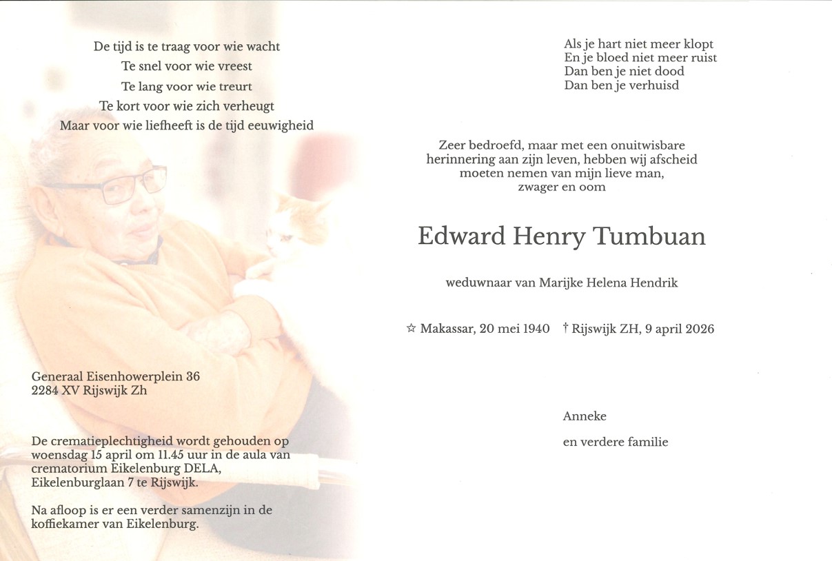 Hierbij het droevige bericht dat Ed Tumbuan is overleden.